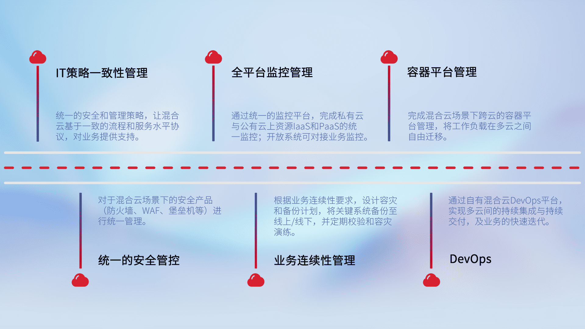 通过多云纳管,,以统一的资源数据模型把客户的云资源进行抽象和封装,,,进而实现对多云资源的统一操作,,保障云资源管理的可靠性、、、稳定性与可用性。。。。量身定制化运维内容,,,,配置、、、、开发运维、、、补丁管理、、、、备份、、监控、、、认证和访问管理、、、、审计和日常巡检等,,,保障在用云过程中的可靠度,,,稳定度以及高可用率。。